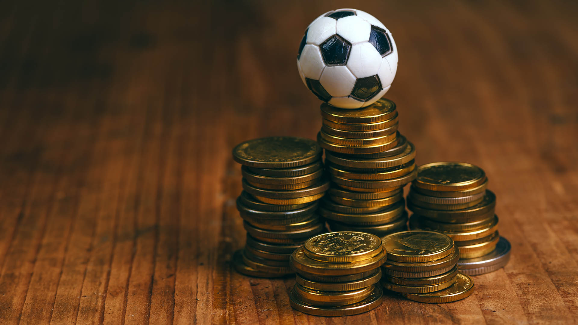 Soccer bet concept with small football on top of coin stack, making money by predicting sport results.
